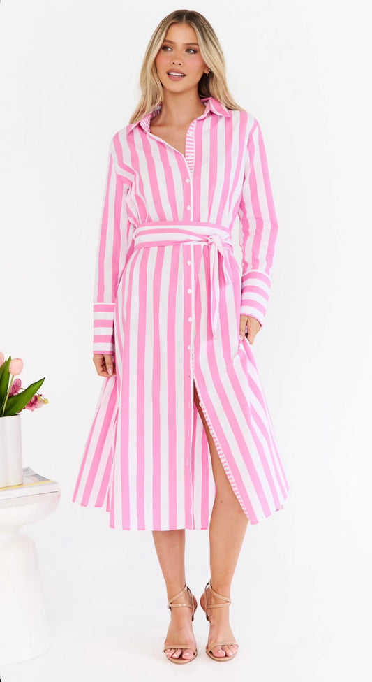 Stripe Long Sleeve Shirt Maxi Dress - Pink