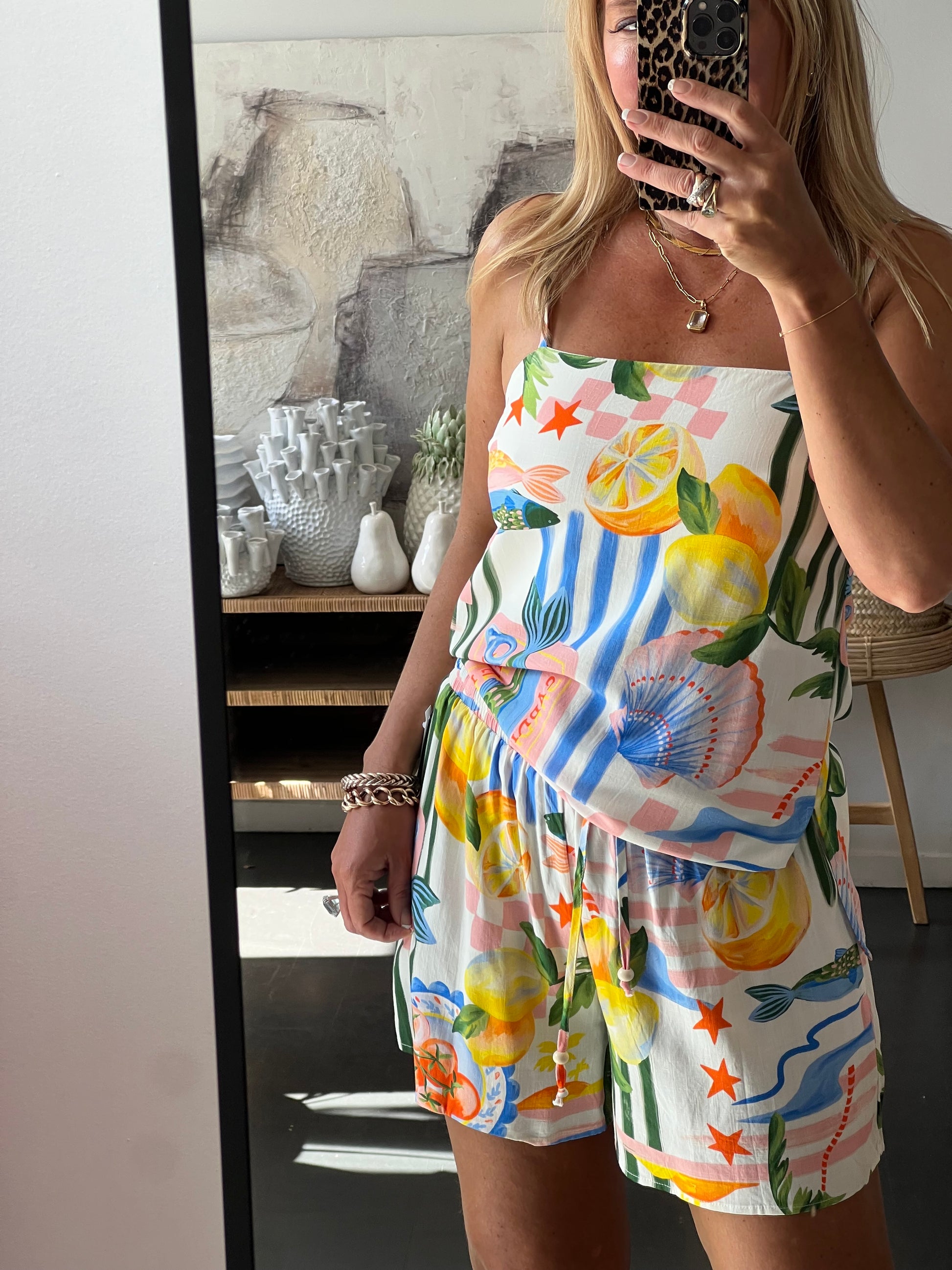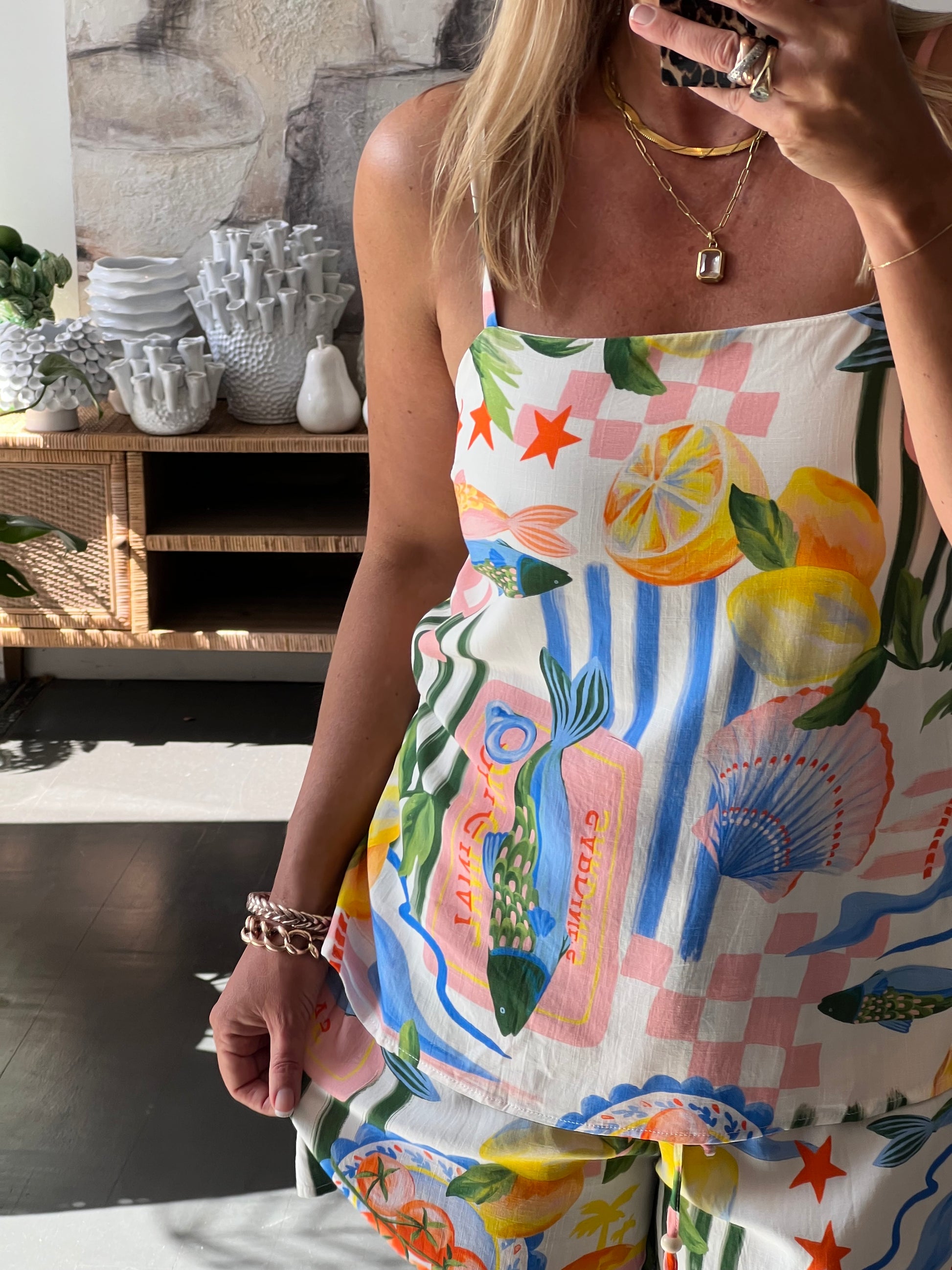 A relaxed, effortless cut that exudes style. The top is so cute! I relaxed Cami cut with tabard slits along the sides - a flattering make that pairs perfectly with the shorts; with an elasticated waist with drawstring