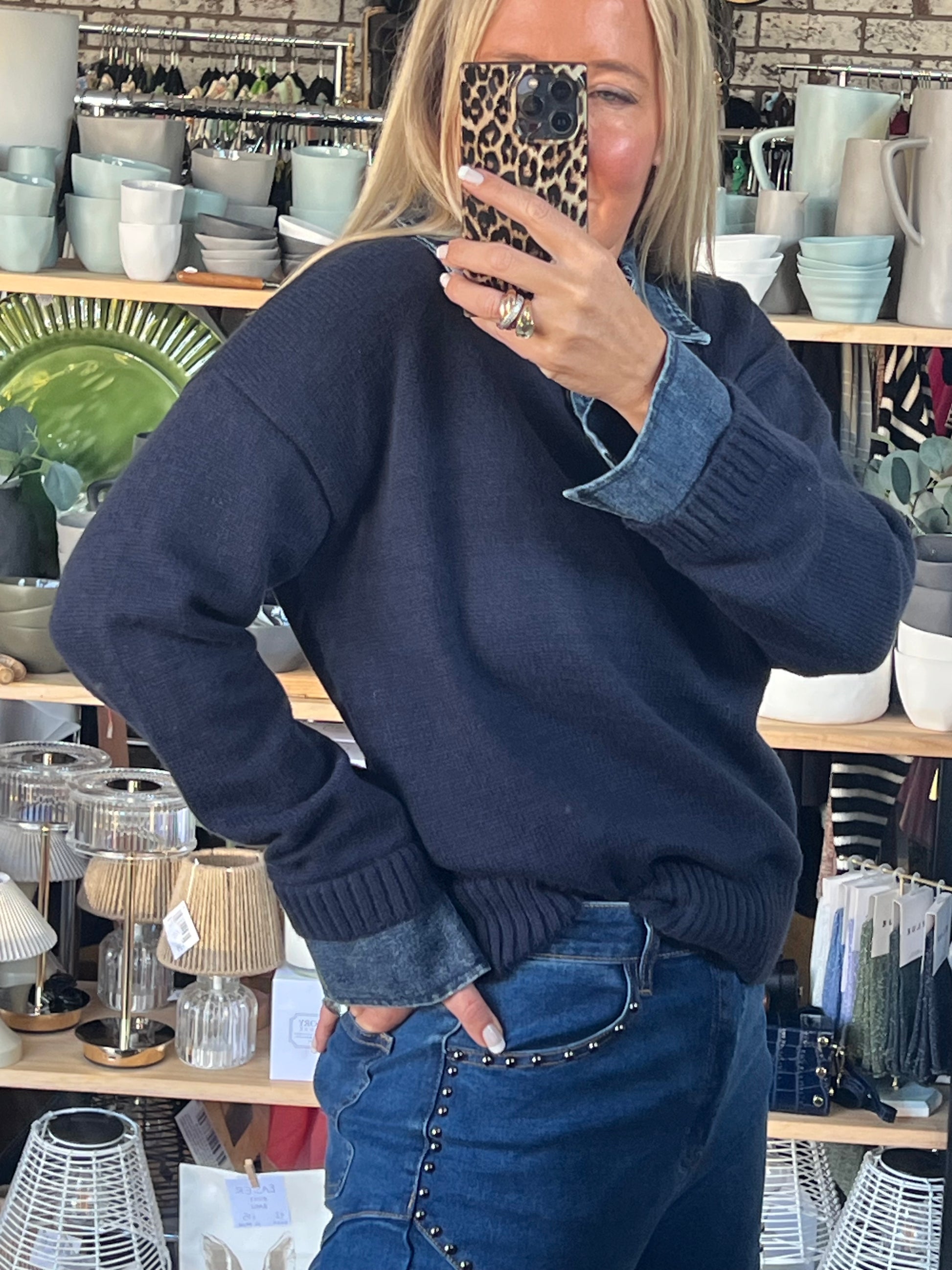 Constructed from a soft knit the features A contrast shirt, collar and cuff in denim .