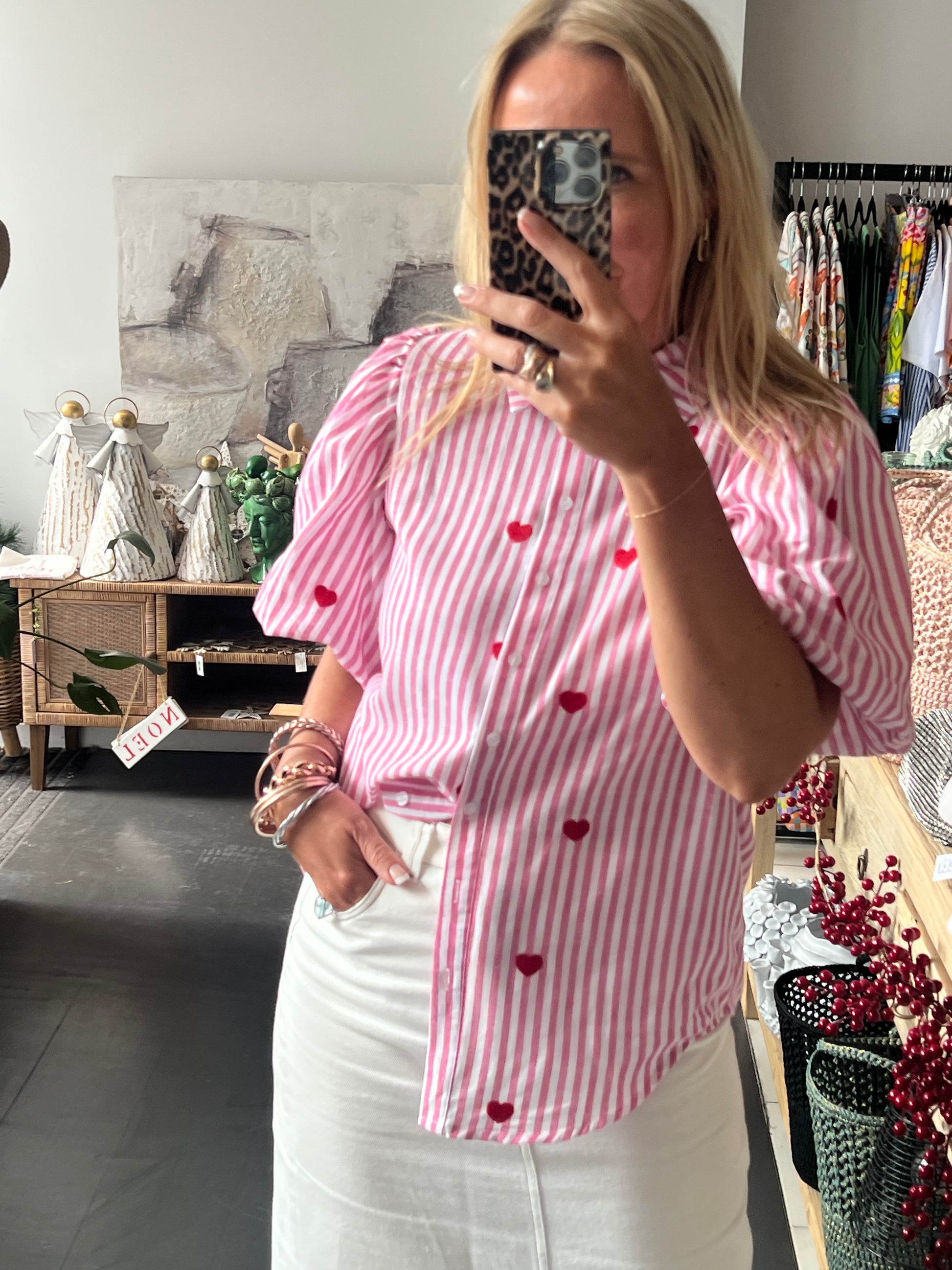 Hearts Puff Sleeve Cotton Shirt Top- pink