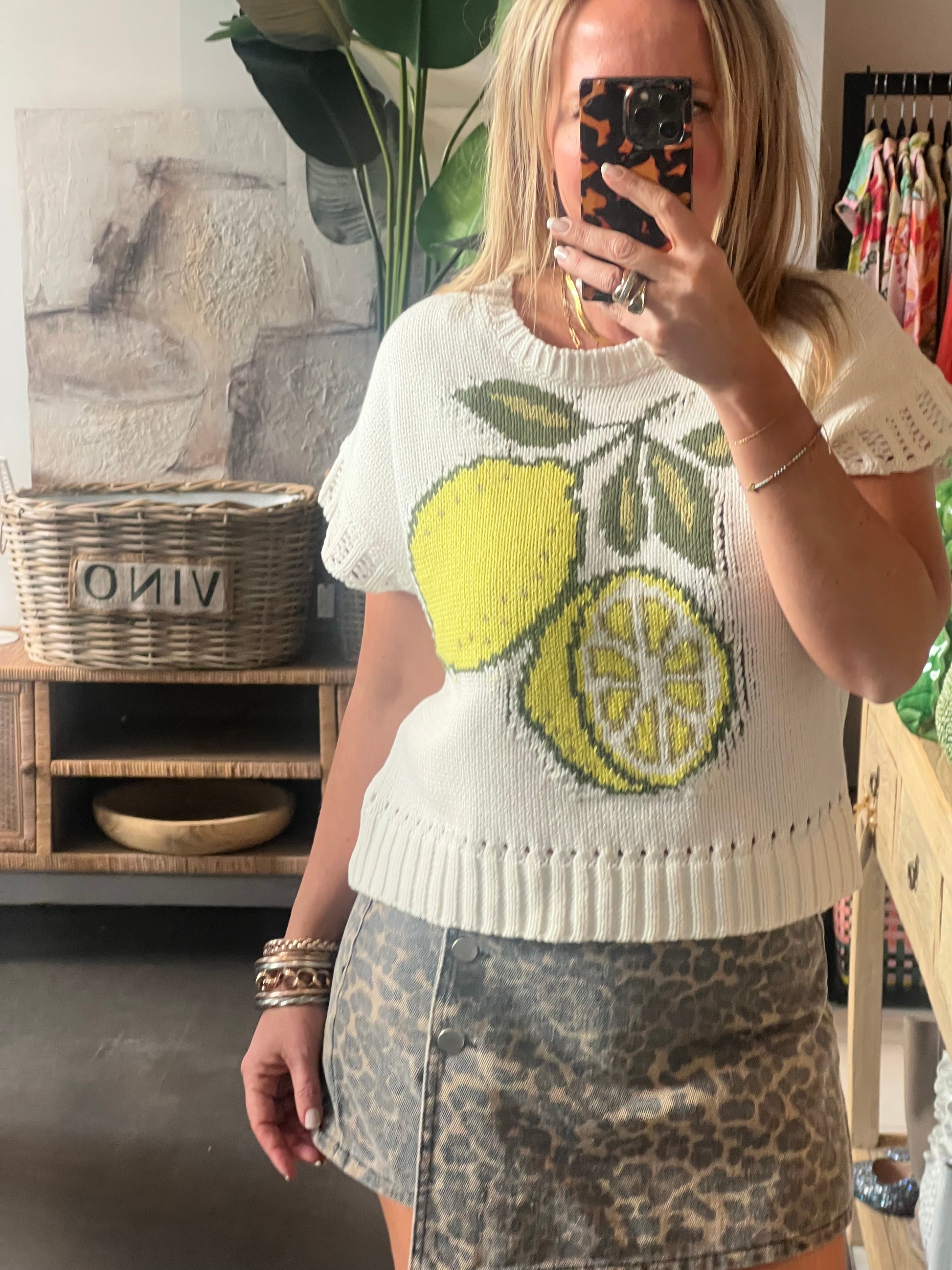 Freshen up your basics this season in our short sleeve knit sweater - it is a fresh addition to any wardrobe! … Featuring super cute Mediterranean lemon detail knitted motif - a flattering cut, this top is ideal especially in trans seasonal weather