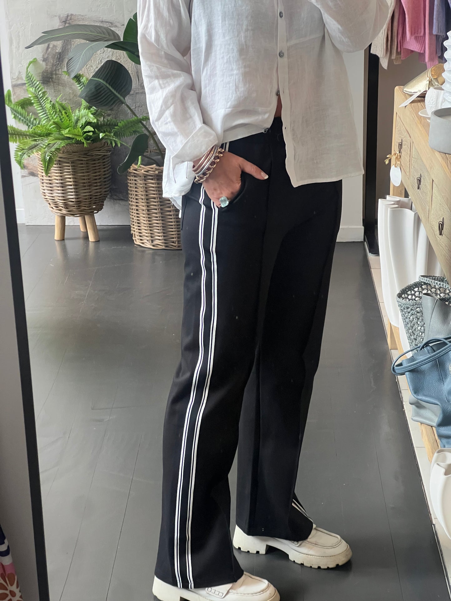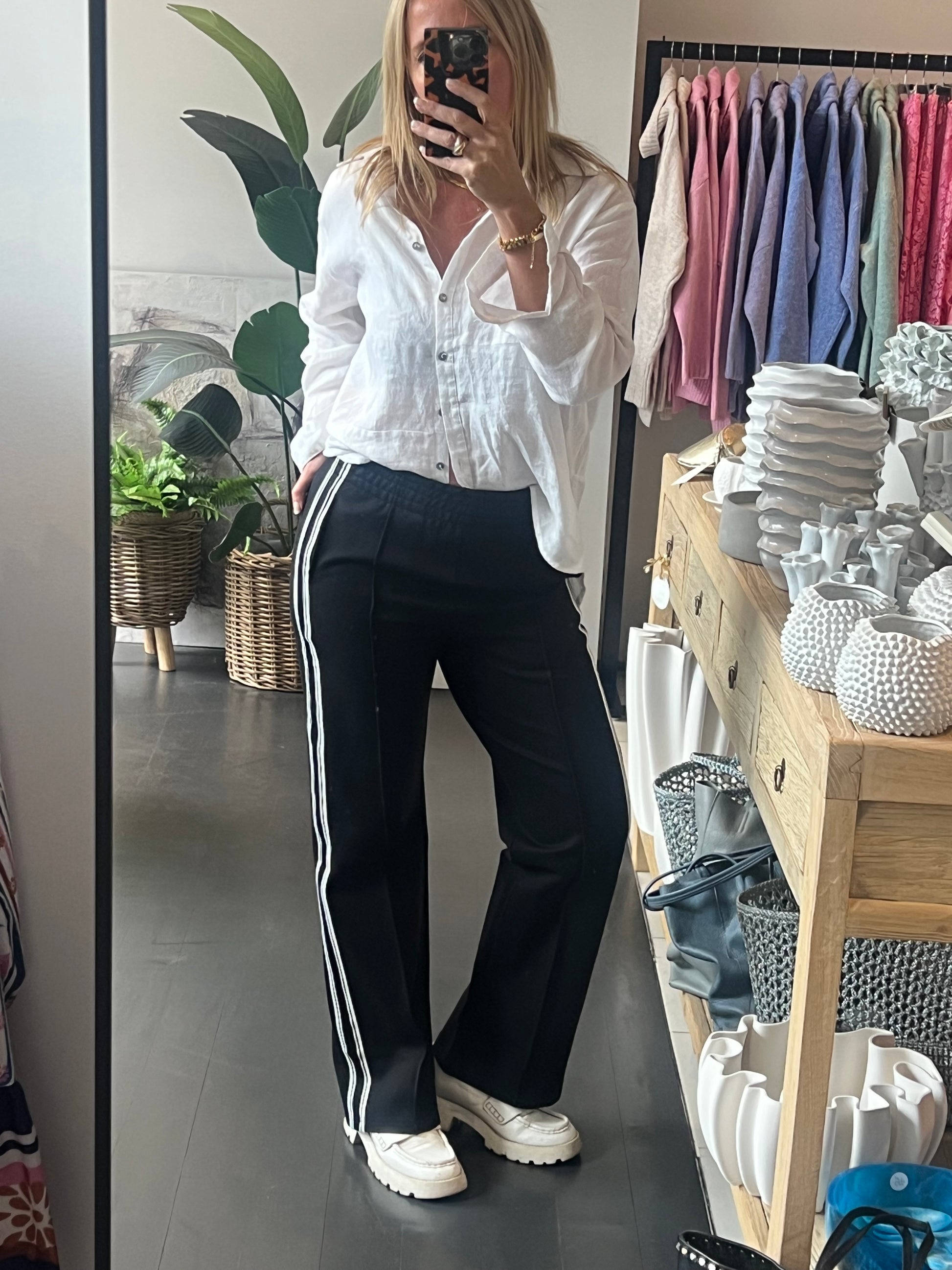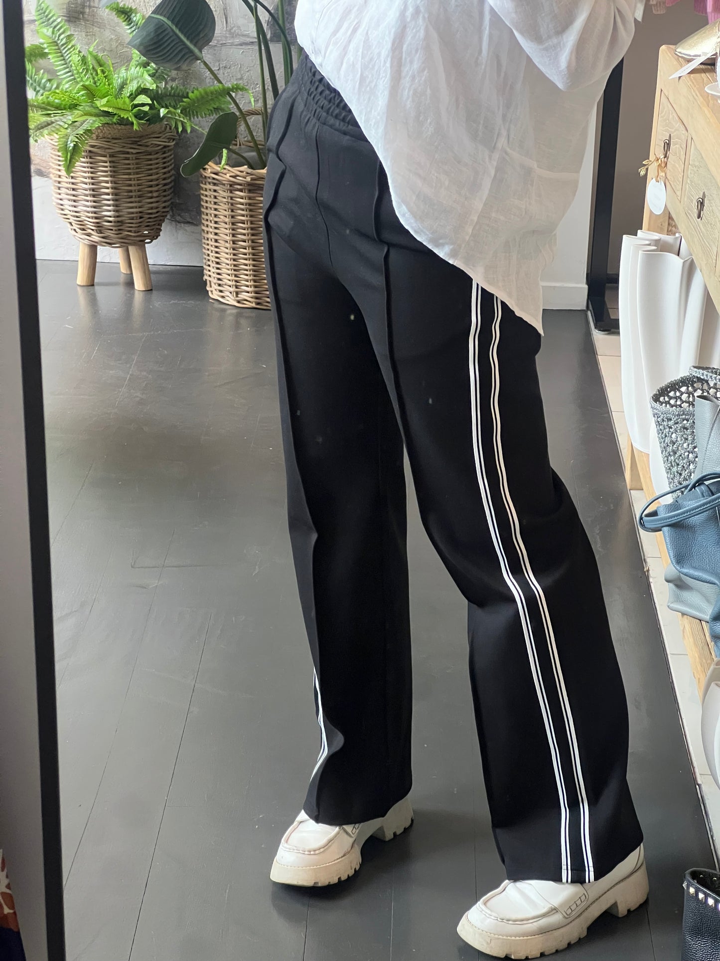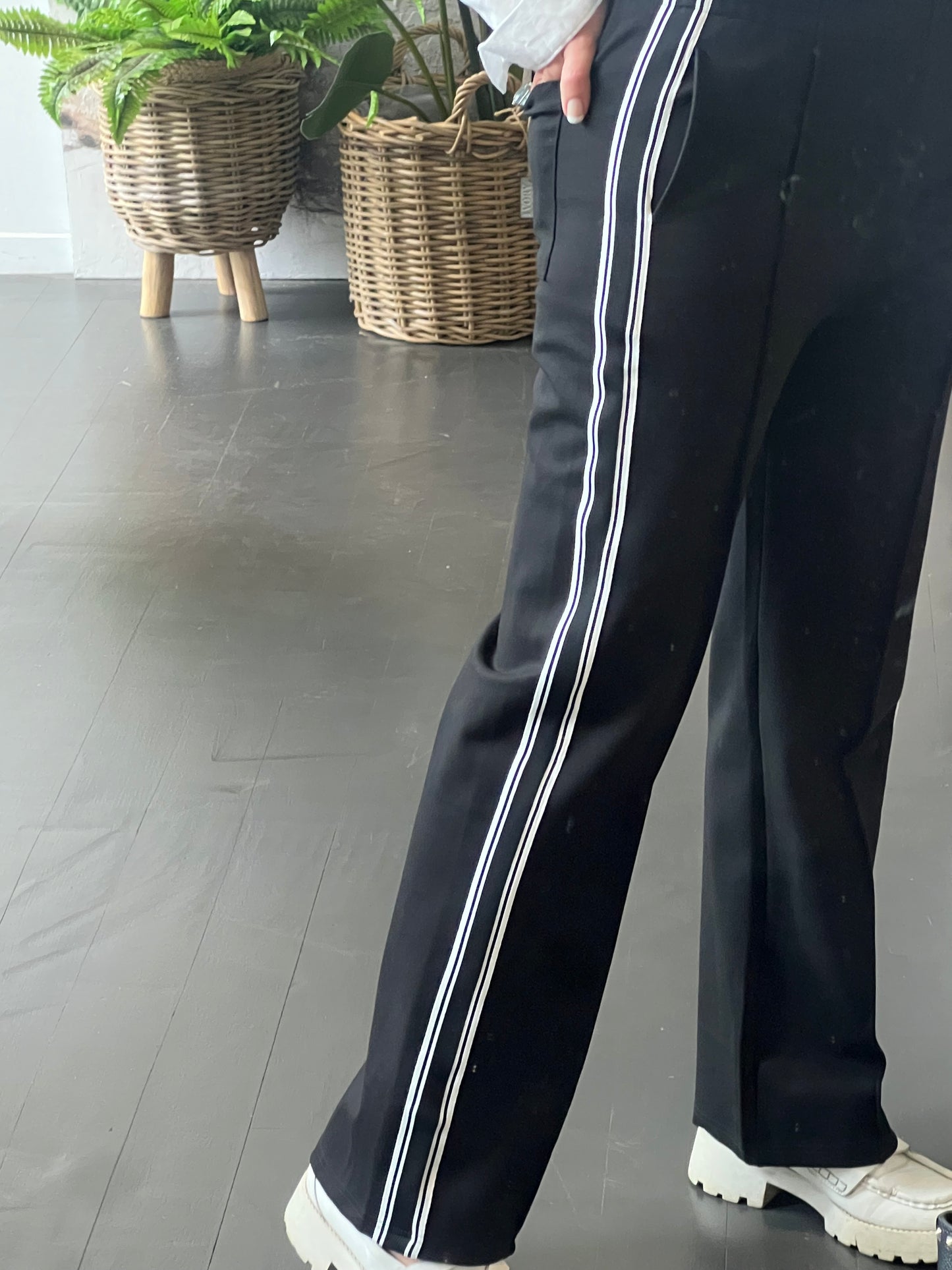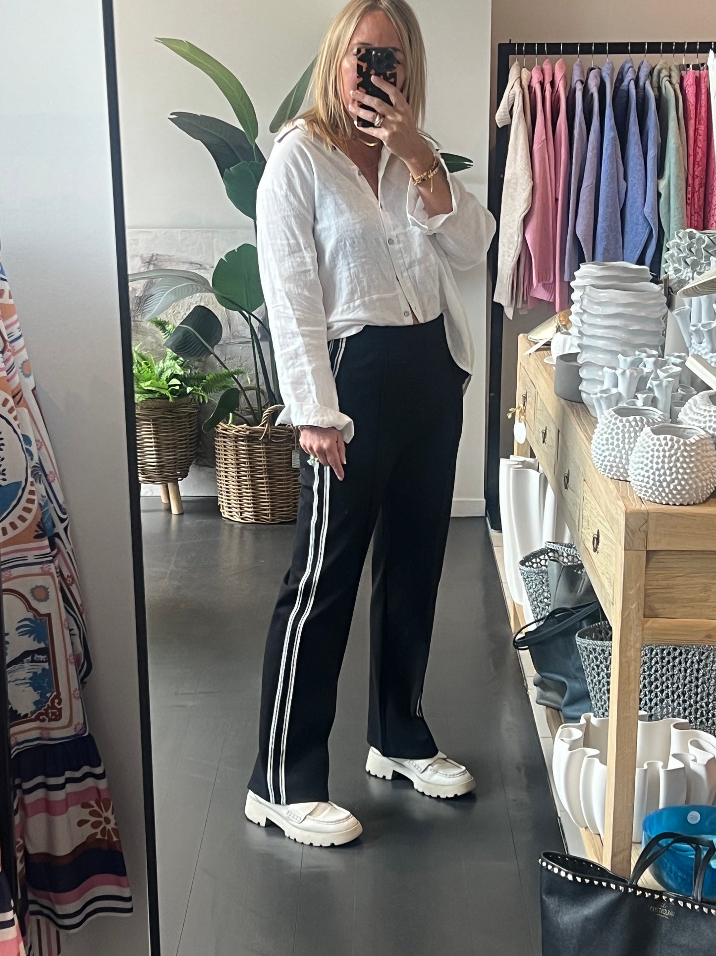 A relaxed, and the most flattering cut that exudes effortless style. Featuring a straight leg cut with an elasticated pull on style waist, that sits flat -the vertical contrasting white stripe is bils while tge subtle pintuck detail completes these chic pants, elevating them to the next level