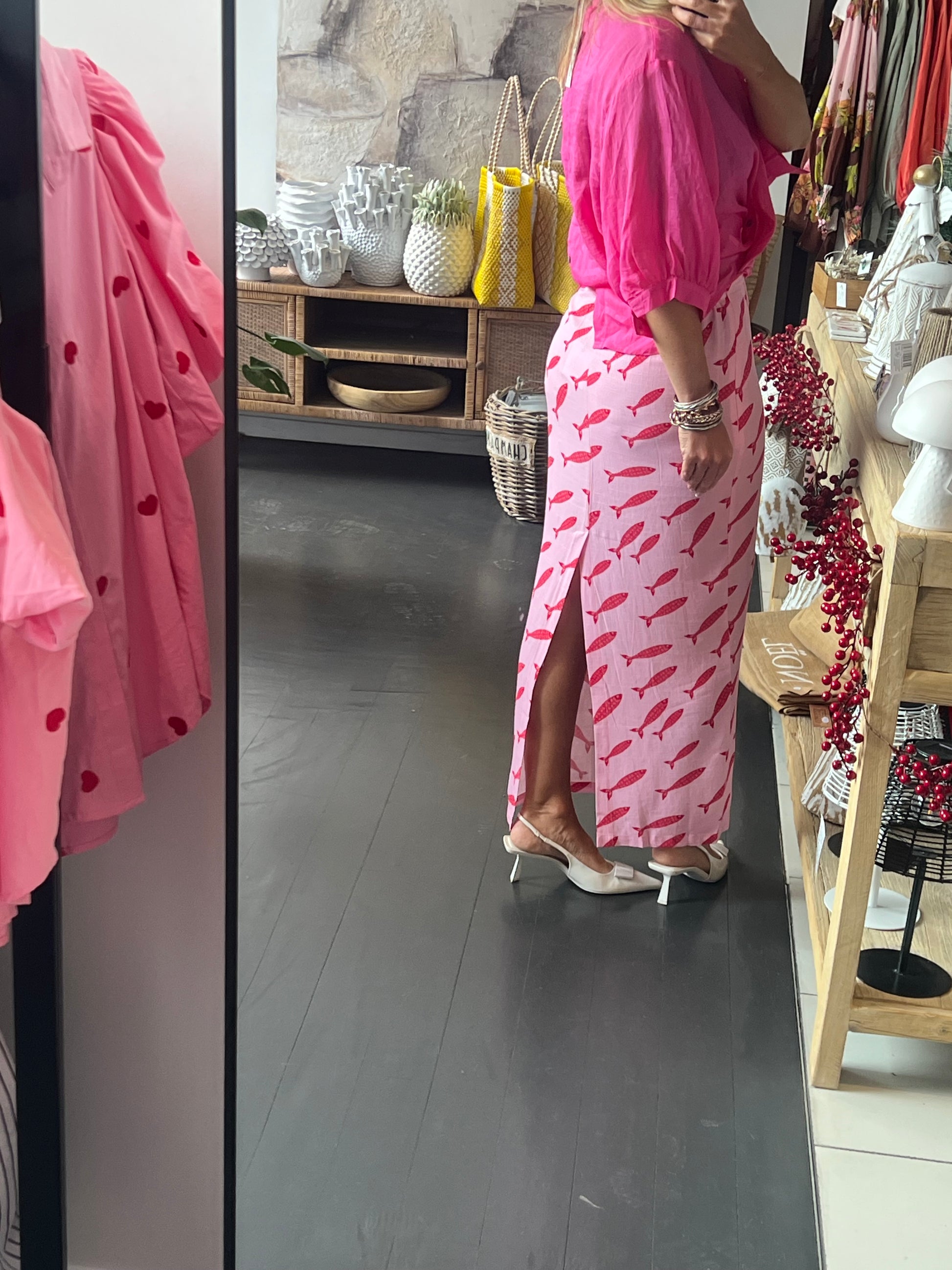 The fit is universally flattering, offering effortless comfort for every shape. Its standout feature is the vibrant Mediterranean-inspired print of swimming sardines in pink and red, this season’s most coveted colour combination.